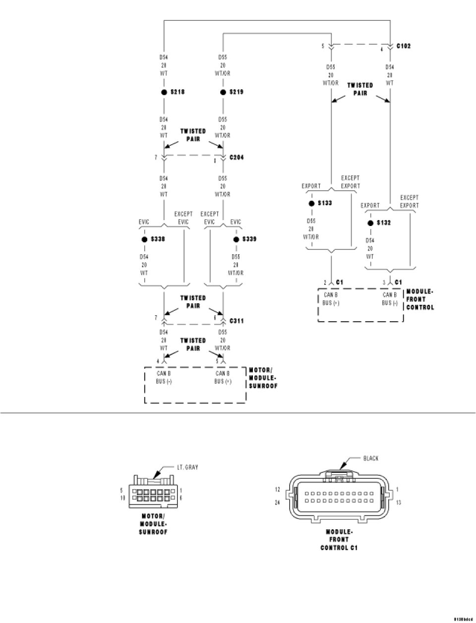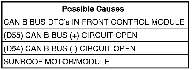 Measure the resistance of the (D55) CAN B Bus (+) circuit between the Front Control Module C1 connector and the Sunroof Motor/Module connector.