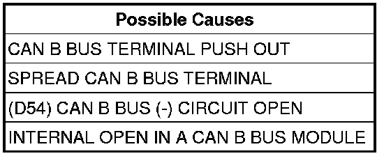 - Repair the (D54) CAN B Bus (-) circuit for an open between the next common splice and the module that has the red X displayed next to it. Use the wiring diagrams to help you determine where the open condition exists.