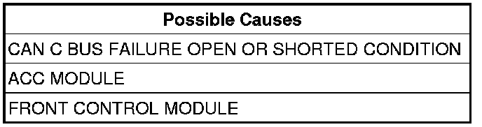 The ACC Module doesn't receive a Bus Message from the FCM within 60 millisecond. The ACC module will disable the Adaptive Cruise Control (ACC) system and the ACC UNAVAILABLE message will display in the CCN. Once the DTC goes to stored, the ACC system will return to normal operation. The DTC will be cleared after the ACC Module sees 100 consecutive key cycles of the STORED DTC.