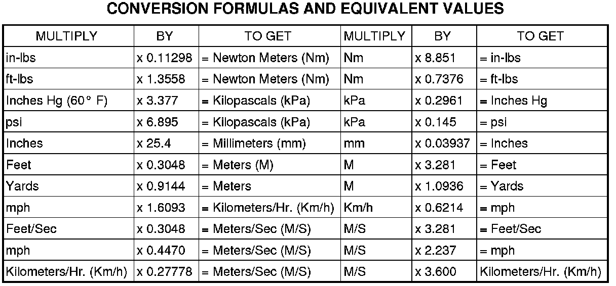 Refer to the Metric Conversion Chart to convert torque values listed in metric Newton- meters (Nm). Also, use the chart to convert between millimeters (mm) and inches (in.).