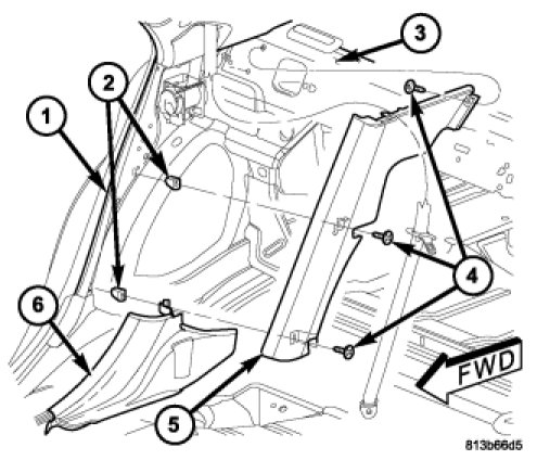 2. Position the lower C-pillar trim (5) onto the quarter inner panel with the lower edge sequenced over the rear extension of the rear door sill scuff plate (6).