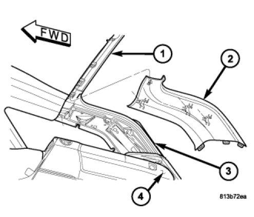 1. Engage the lower edge of the upper D-pillar trim (2) under the upper edge of the quarter trim panel (4) at the inner D-pillar (3).