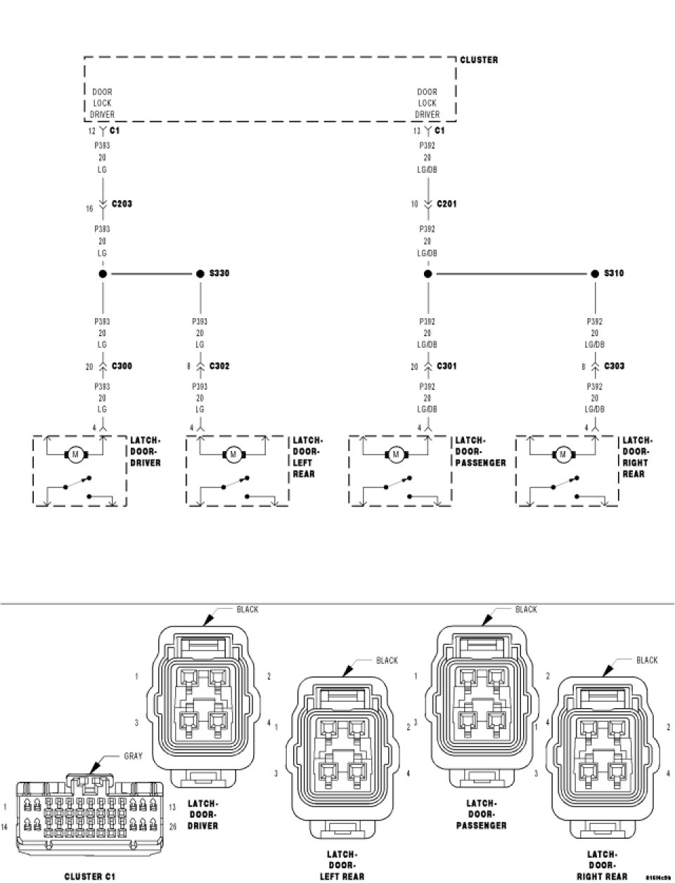 Both the Door Lock Driver circuits (P392 and P393) are connected together inside the Cluster. Therefore either circuit shorted will affect all door locks. Depending on where the short is, some doors may lock.