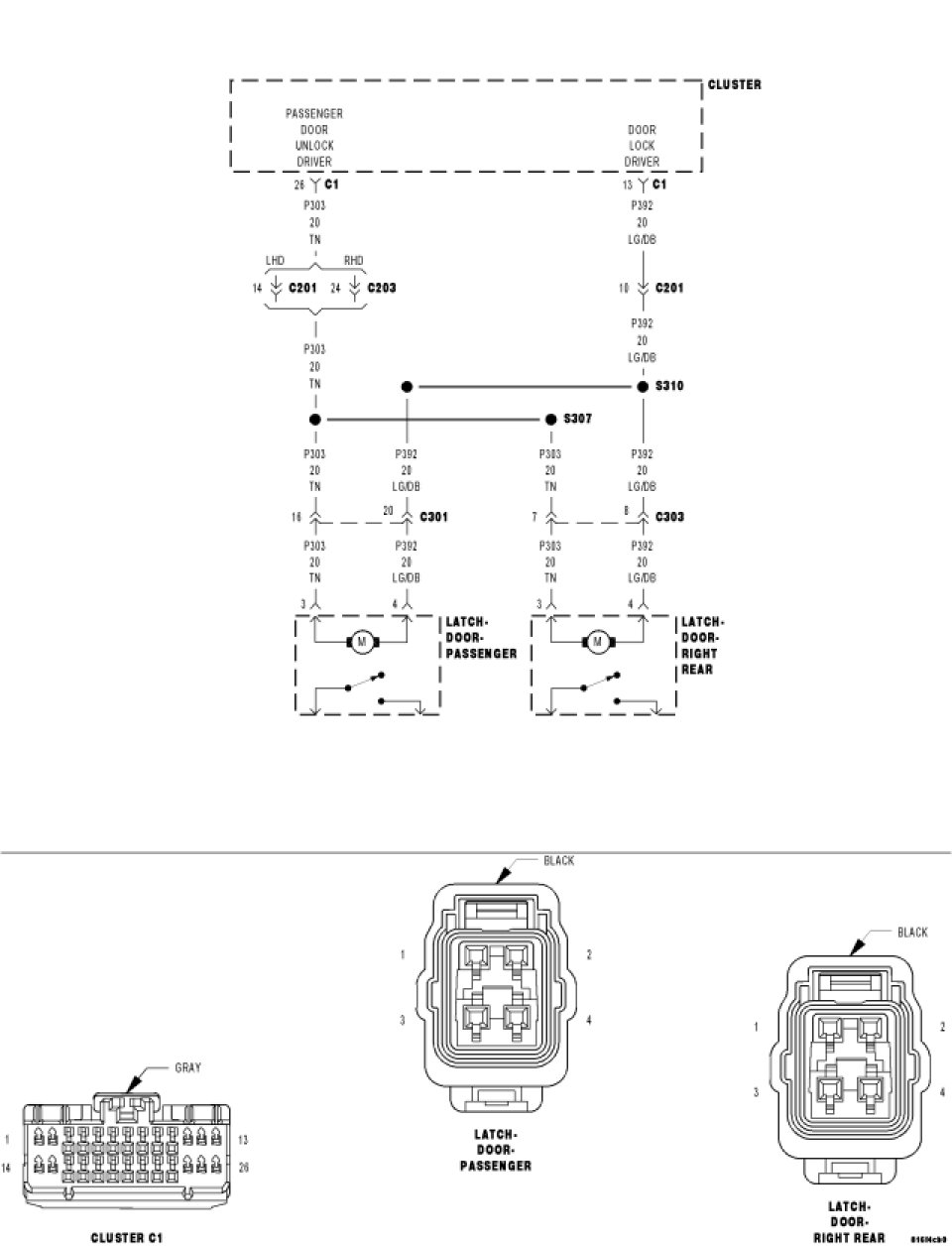 Measure the resistance of the (P392) Door Lock Driver circuit between the Cluster C1 connector and the Right Door Latch connector.