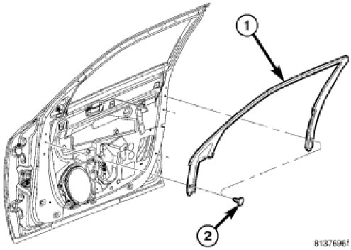5. Install the two push pins (2) that secure the window trim molding to the front door.