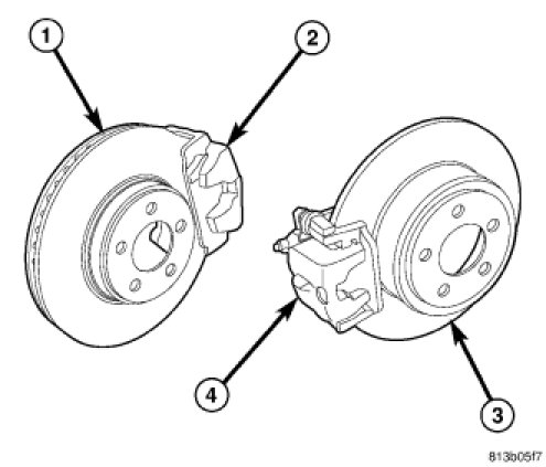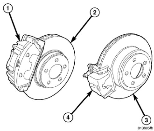 "Eighteen-inch" four-wheel disc brakes (so called because they are designed to fit inside 18-inch wheels) are standard on Chrysler 300 Hemi C and all international models, and optional on other models. They feature twin-piston aluminum calipers (1) and vented rotors (2) in the front and single-piston aluminum calipers (4) with vented rotors (3) in the rear. Although the rear calipers appear the same as the 17-inch system, the rear calipers used with this system feature a wider jaw to compensate for the wider, vented brake rotors used.