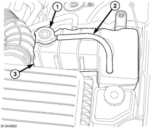 NOTE: Do not remove radiator cap for routine coolant level inspections. The coolant level can be checked at coolant recovery bottle (2).