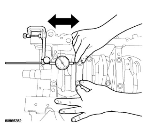 1. Mount a dial indicator to a stationary point on engine. Locate probe perpendicular to and resting against the connecting rod cap being checked. Move connecting rod all the way to rear of its travel. Zero the dial indicator. Move connecting rod forward to limit of travel and read the dial indicator. Compare measurement to specification listed in engine specifications Engine Specifications. Repeat procedure for each connecting rod. Turn crankshaft for connecting rod accessibility.