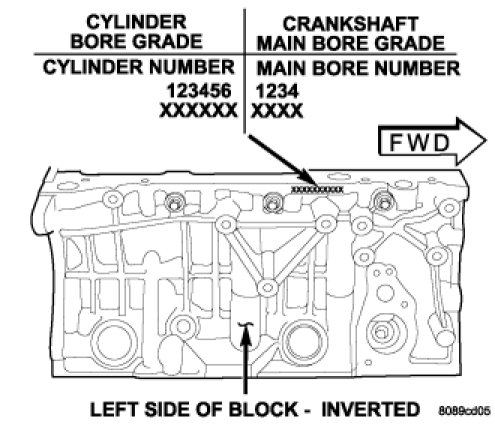 The grade marks for the cylinder block main bearing bore grade is located on the pan rail just below the left side engine mount bracket. These marks are read left to right, corresponding to main bore 1, 2, 3, 4.