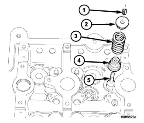 1. The valve stem seal/valve spring seat (4) should be pushed firmly and squarely over the valve guide using the valve stem (5) as guide. Do Not Force seal against top of guide.