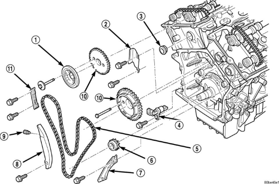 The primary timing chain (5) is a double-flexure, inverted tooth type chain. The primary chain drives both of the intake camshafts directly from a sprocket mounted on the crankshaft. In addition, the water pump is driven by the "back side" of the primary chain, necessitating the double-flexure type chain.