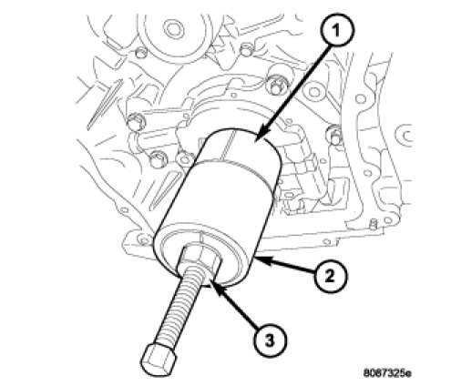 2. Remove crankshaft sprocket by first installing the crankshaft damper bolt. Apply grease or equivalent to damper bolt head and position Special Tools 5048-1(3), 5048-6 (2), and 8539 (1) on sprocket and crankshaft nose. Remove sprocket using care not to rotate the crankshaft.