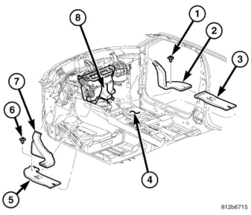 7. Install the push-pin fastener (6) that secures the driver side rear intermediate floor distribution duct to the floor support.