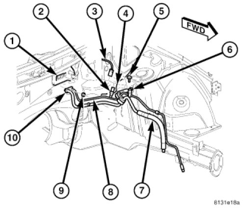 6. Disconnect the A/C suction line (7) and the A/C liquid line (8) from the A/C expansion valve and position the refrigerant lines out of the way.