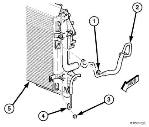 10. Install the nut (3) that secures the front section of the A/C liquid line to the A/C condenser. Tighten the nut to 22 Nm (16 ft. lbs.).