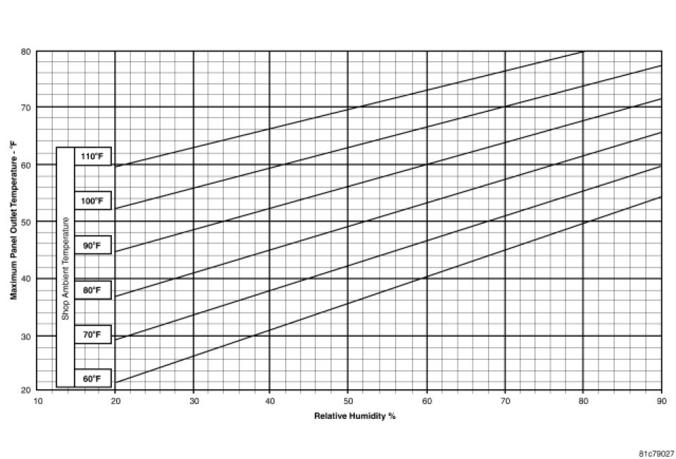 5. With the A/C compressor clutch engaged, compare the observed panel outlet air temperature along with the ambient temperature of the work area and the relative humidity to the Maximum Panel Outlet Temperature chart.