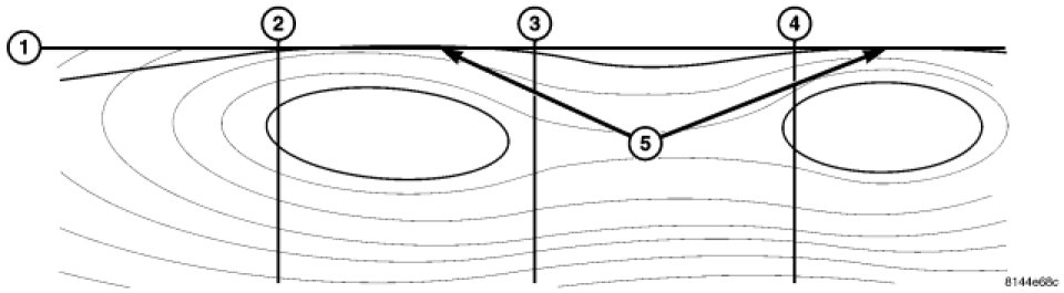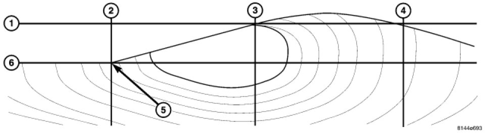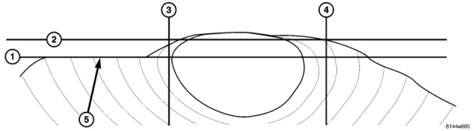 With the horizontal centerline of the headlamp (2) transferred on the wall, measure down 53 mm (2.1 in). This line (1) will be the vertical aiming mark. Using the left side of the headlamp vertical centerline (3), adjust the headlamp unit so the residual light from the headlamp, not the hot spot, is even with the line (1) that was marked previously 53 mm (2.1 in) below the horizontal centerline (2). The ideal alignment should be (5). The right headlamp aiming will be the same, but using the area left of right headlamp vertical centerline (not shown).