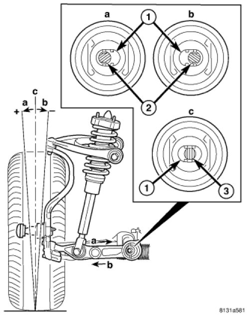 - To achieve more positive caster, refer to (a) in the figure. Move the lower control arm in the desired direction, then insert the adjustment bolt (2) with a washer installed through the bat wing hole in the engine cradle (1) and the round hole in the bushing inner metal.