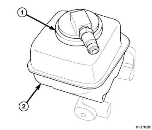 1. Remove filler cap from the top of fluid reservoir (2) on master cylinder.