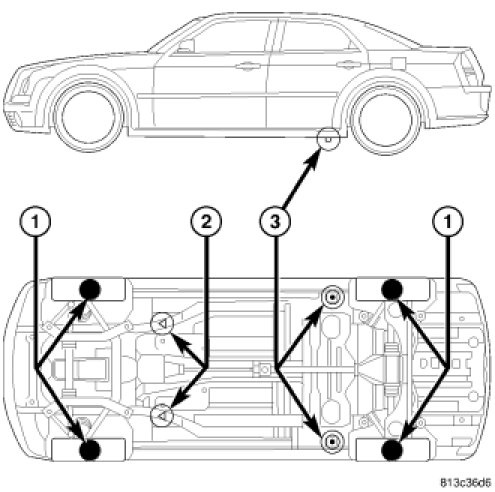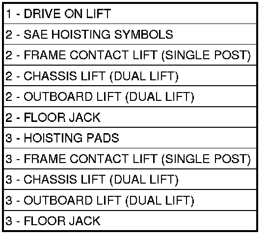 WARNING: THE HOISTING AND JACK LIFTING POINTS PROVIDED ARE FOR A COMPLETE VEHICLE. WHEN THE ENGINE OR REAR SUSPENSION IS REMOVED FROM A VEHICLE, THE CENTER OF GRAVITY IS ALTERED MAKING SOME HOISTING CONDITIONS UNSTABLE. PROPERLY SUPPORT OR SECURE VEHICLE TO HOISTING DEVICE WHEN THESE CONDITIONS EXIST.