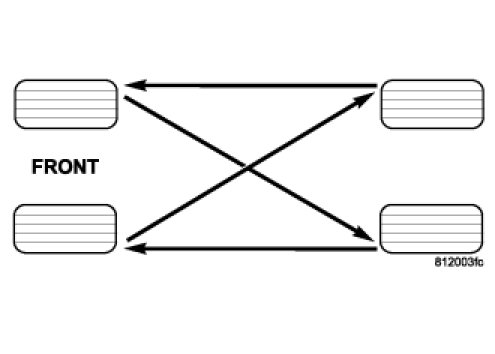 The suggested method of tire rotation is shown in graphic. Other rotation methods can be used, but they will not provide all the tire longevity benefits.