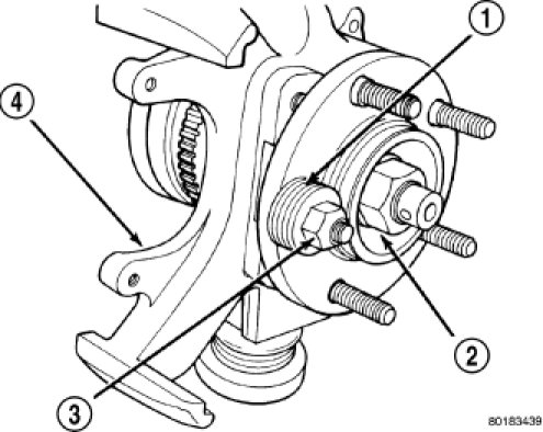 2. Tighten nut (3), pulling wheel stud into hub flange. Once head of stud is fully seated against rear of hub flange, remove nut and washers from stud.