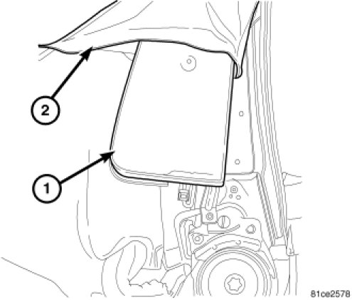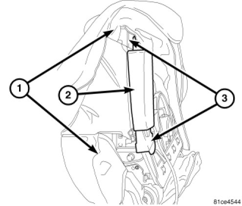 1. Carefully slide the seat airbag (1) into the nylon pouch (2) integral to the outboard side of the front seat back. Make sure the locating tab on the upper portion of the air bag locks securely into the side of the seat frame, then secure the air bag to the seat frame using air bag retaining screw.