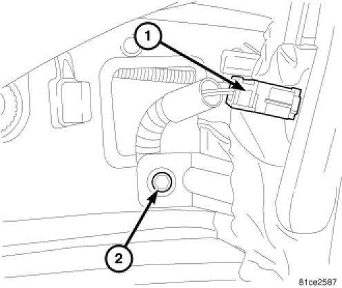 3. Reconnect the seat wire harness (1) connector to the seat airbag inflator. Be certain that the connector latches and lock are fully engaged.