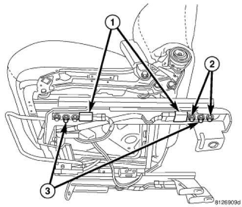 NOTE: If the vehicle is equipped with a power front passenger seat, to remove the adjuster from the riser it is necessary to have battery power to move the seat forward and rearward to access the mounting bolts.
