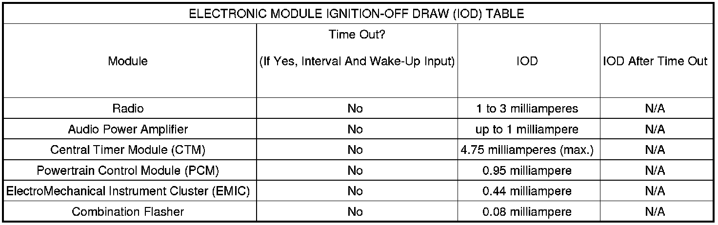 The term Ignition-Off Draw (IOD) identifies a normal condition where power is being drained from the battery with the ignition switch in the Off position. A normal vehicle electrical system will draw from five to thirty-five milliamperes (0.005 to 0.035 ampere) with the ignition switch in the Off position, and all non-ignition controlled circuits in proper working order. Up to thirty-five milliamperes are needed to enable the memory functions for the Powertrain Control Module (PCM), digital clock, electronically tuned radio, and other modules which may vary with the vehicle equipment.