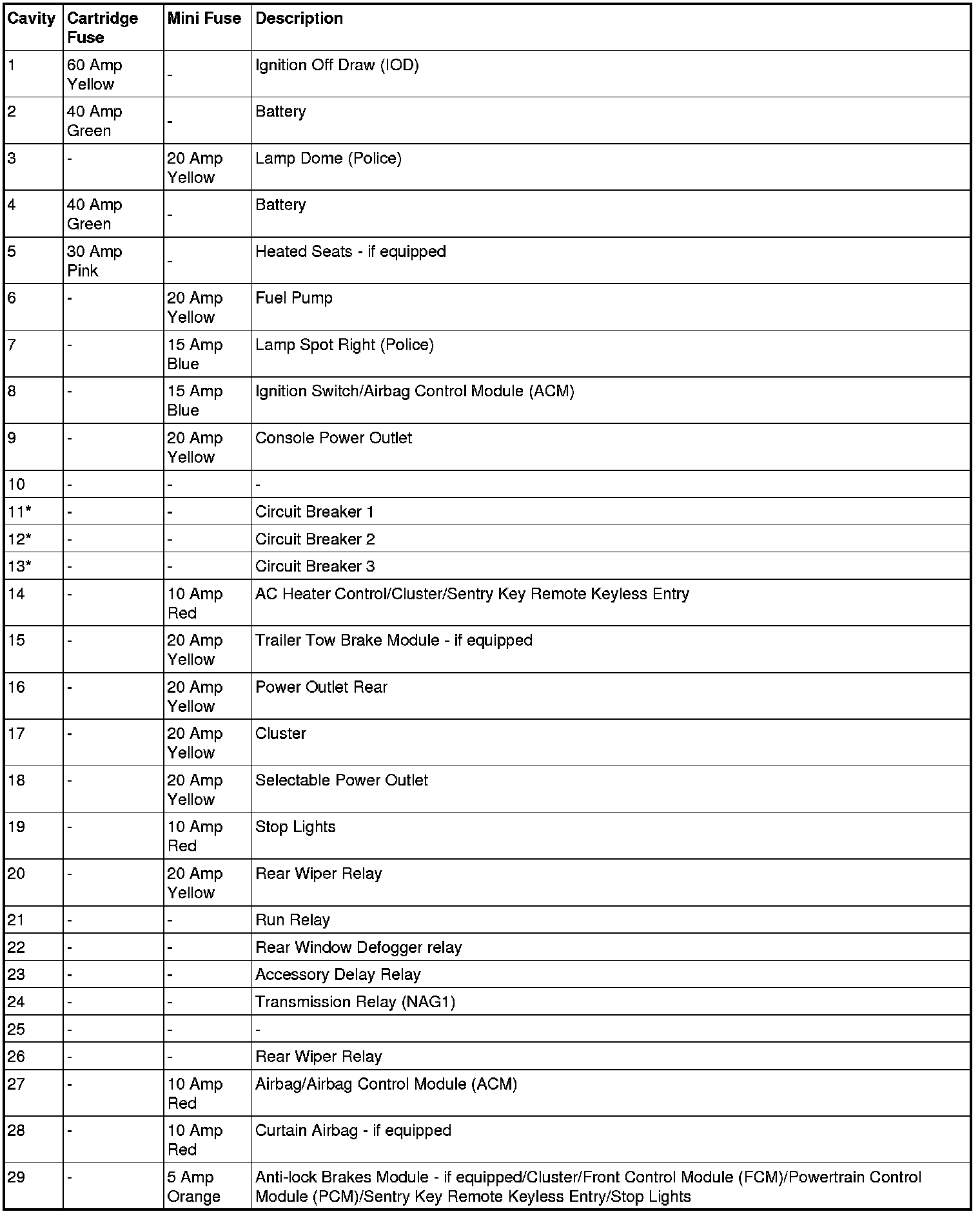 * Cavities 11, 12, and 13 contain self-resetting fuses (circuit breakers) that are only serviceable by an authorized dealer. The Cluster (without power memory seat), the Driver Seat Switch (with power memory seat), and the Memory Module (if equipped) are fused by the 25 amp circuit breaker in Cavity 11. The Passenger Seat Switch is fused by the 25 amp circuit breaker in Cavity 12. The Door Modules (except base), the Driver Door Lock Switch (base), the Driver Express Power Window Switch (if equipped), and the Passenger Door Lock Switch (base) are fused by the 25 amp circuit breaker in Cavity 13. If you experience temporary or permanent loss of these systems, see your authorized dealer for service.