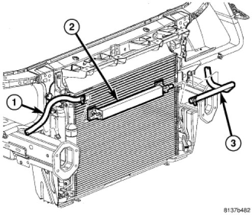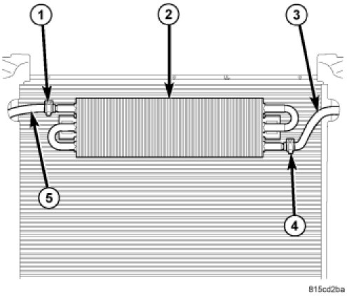 Unlike the standard power steering fluid cooler which makes one pass across the cooling module, the SRT8 (and Police Package) cooler (2) makes three passes across the front of the cooling module.