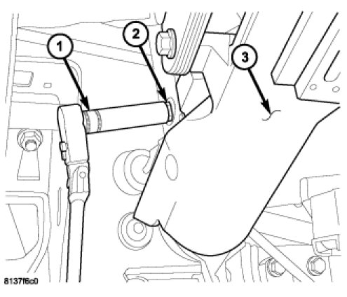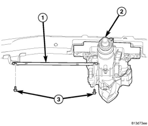 5. If equipped with electronic telescoping column, Install the screws (3) fastening the brace (1) to the steering column (2) and support beam bracket. First, tighten mounting screw at the column to 29 Nm (21 ft. lbs.). Then, tighten mounting screw at the support beam to 12 Nm (106 in. lbs.).