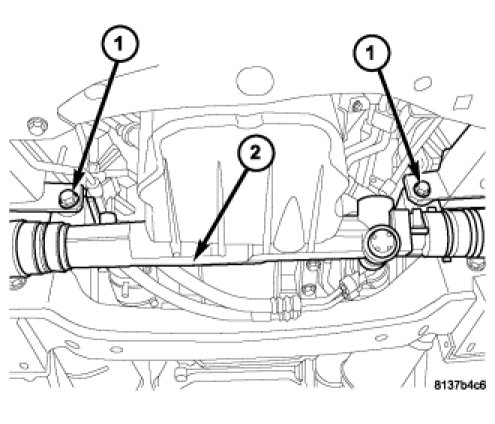 2. Lift steering gear (2) into mounted position and install steering gear mounting bolts (1). Tighten bolts to 95 Nm (70 ft. lbs.).