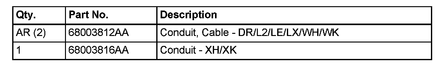 9. Slide the new conduit, p/n 68003816AA, back over the drive cable. See (Fig. 6) item 1, to ensure conduit is seated into notch to the rear of the steel drive cable tube.