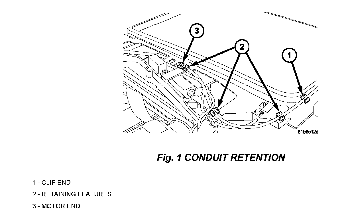 3. Remove the kinked cable conduit(s) from sunroof module retaining features starting from the end at the metal clip and work back to motor area, see (Fig 1).