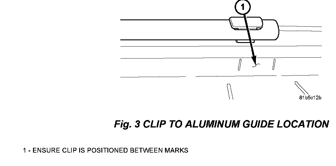5. Snap the cable conduit into the retaining features in the rear bulk head (5 places) with the end of the tube retained in spring clip on the aluminum guide. Ensure the clip is within the provided scribe lines on aluminum guide, (Fig 3).