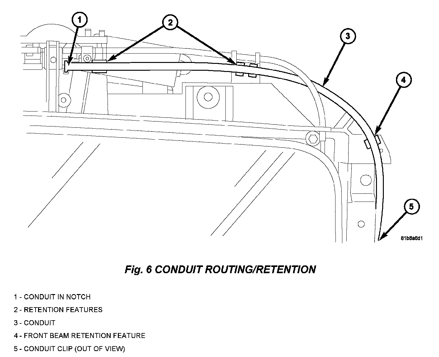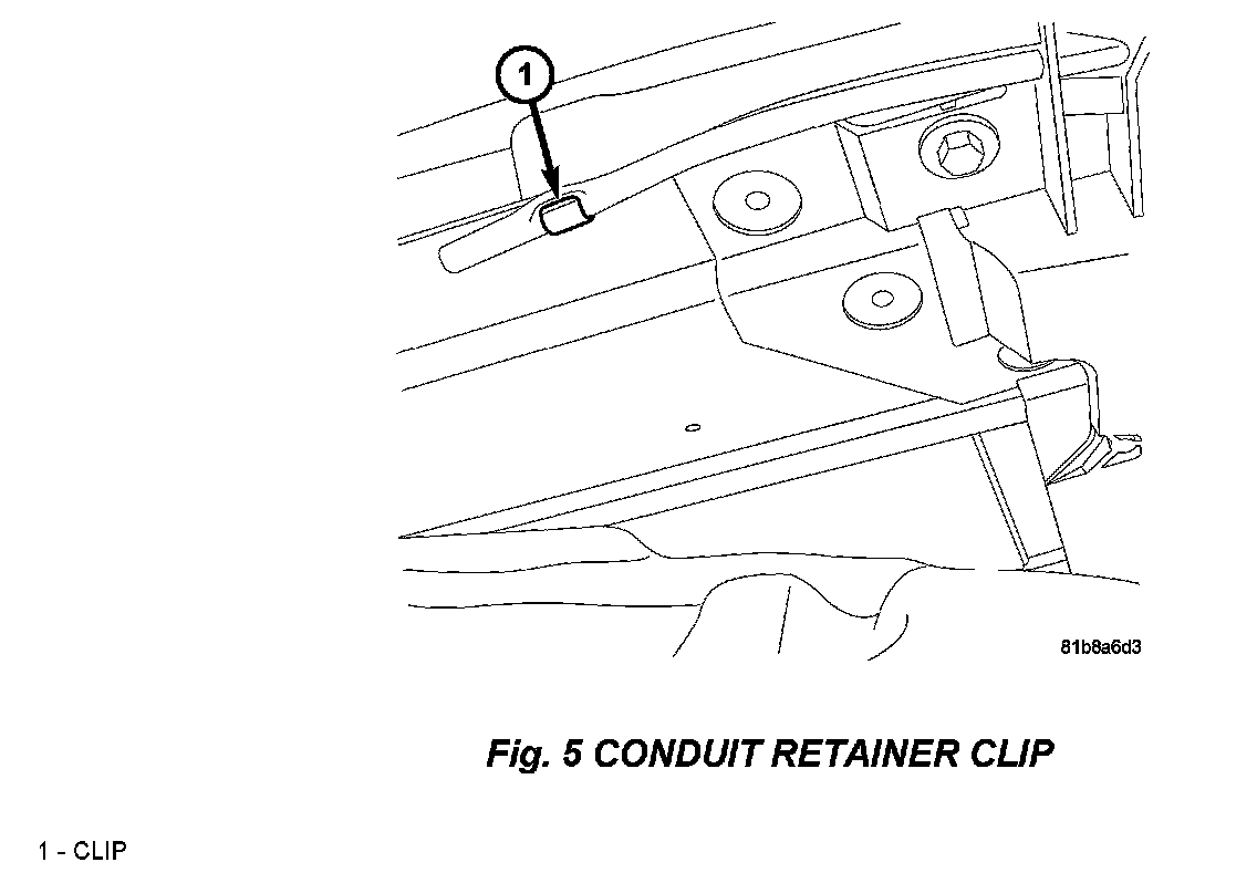 6. Push the conduit up and inboard to release it from the retention feature on the front beam, (Fig 6) item 4.