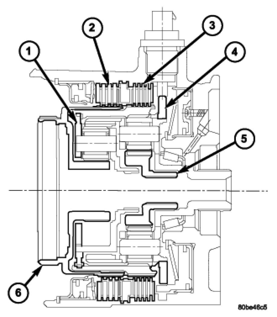 Two hydraulically applied multi-disc clutches are used to hold planetary geartrain components stationary while the input clutches drive others. The 2/4 (2) and Low/Reverse (3) clutches are considered holding clutches and are contained at the rear of the transmission case.