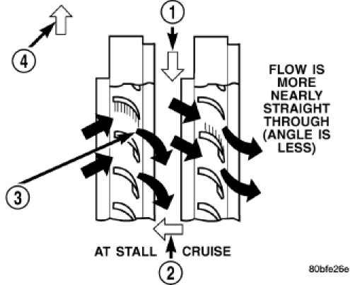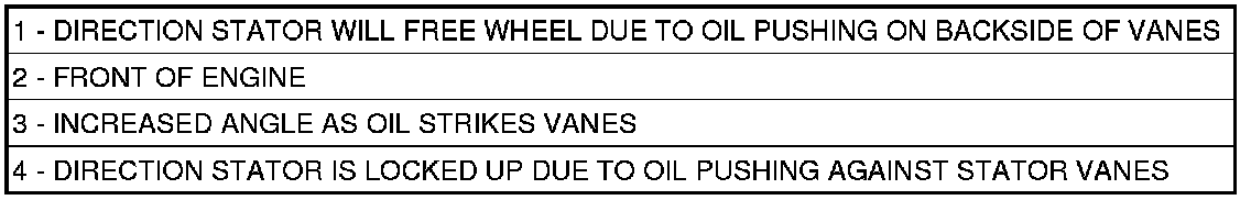 Torque multiplication is achieved by locking the stator's over-running clutch to its shaft. Under stall conditions (the turbine is stationary), the oil leaving the turbine blades strikes the face of the stator blades and tries to rotate them in a counterclockwise direction. When this happens the over-running clutch of the stator locks and holds the stator from rotating. With the stator locked, the oil strikes the stator blades and is redirected into a "helping" direction before it enters the impeller. This circulation of oil from impeller to turbine, turbine to stator, and stator to impeller, can produce a maximum torque multiplication of about 2.4:1. As the turbine begins to match the speed of the impeller, the fluid that was hitting the stator in such as way as to cause it to lock-up is no longer doing so. In this condition of operation, the stator begins to free wheel and the converter acts as a fluid coupling.