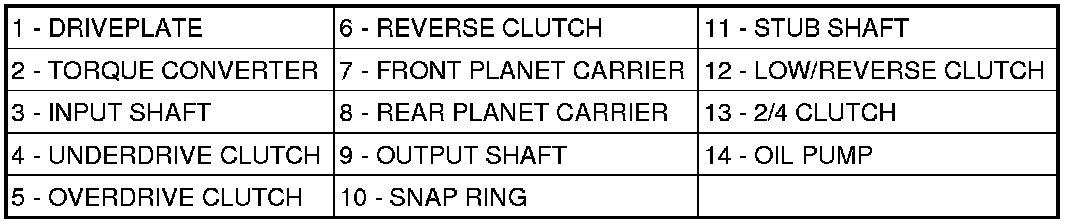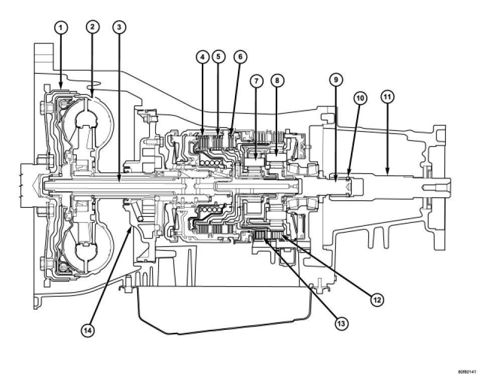 The 42RLE is a four-speed transmission that is a conventional hydraulic/mechanical assembly controlled with adaptive electronic controls and monitors. The hydraulic system of the transmission consists of the transmission fluid, fluid passages, hydraulic valves, and various line pressure control components. An input clutch assembly which houses the underdrive, overdrive, and reverse clutches is used. It also utilizes separate holding clutches: 2nd/4th gear and Low/Reverse. The primary mechanical components of the transmission consist of the following: