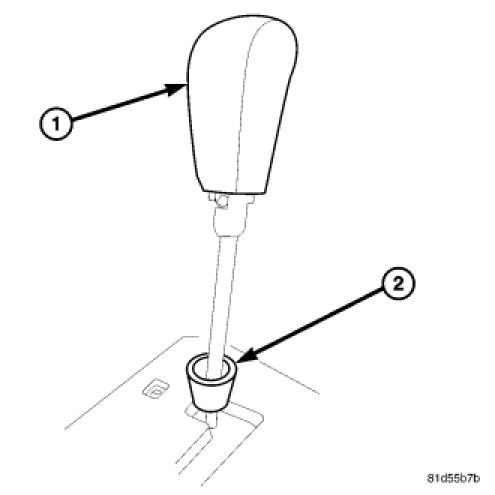 2. Pull up on the shift knob (1) to remove the knob from the shaft then remove the lower trim (2).