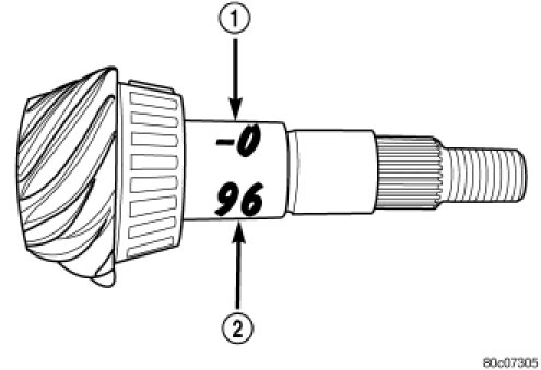Ring gear and pinion are supplied as matched sets. Identifying numbers for the ring gear and pinion are painted onto the pinion gear shaft and the side of the ring gear. A plus (+) number, minus (-) number or zero (0) along with the gear set sequence number (01 to 99) is on each gear. The pinion depth variance (1) is the amount the depth varies from the standard depth setting of a pinion marked with a (0). The remaining numbers (2) are the sequence number of the gear set. The standard depth provides the best gear tooth contact pattern.