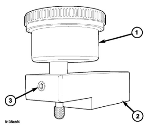 8. Install Dial Indicator 9524 (1) to Scooter Block D-115-2A (2) ( from a Pinion Gauge Set such as 6774). Secure with set-screw (3).