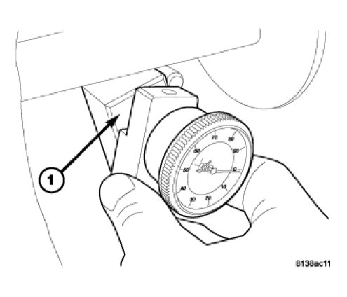 11. Select a shim equal to the dial indicator reading plus the drive pinion gear depth variance number (1) written on the side of the pinion shaft. For example, if the depth variance is -1, add 0.025 mm (0.001 in.) to dial indicator reading.
