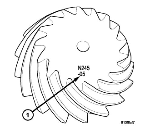 11. Select a shim equal to the dial indicator reading plus the drive pinion gear depth variance number etched into the pinion face (1). For example, if the depth variance is -01, subtract 0.01 mm (0.0004 in.) from dial indicator reading.