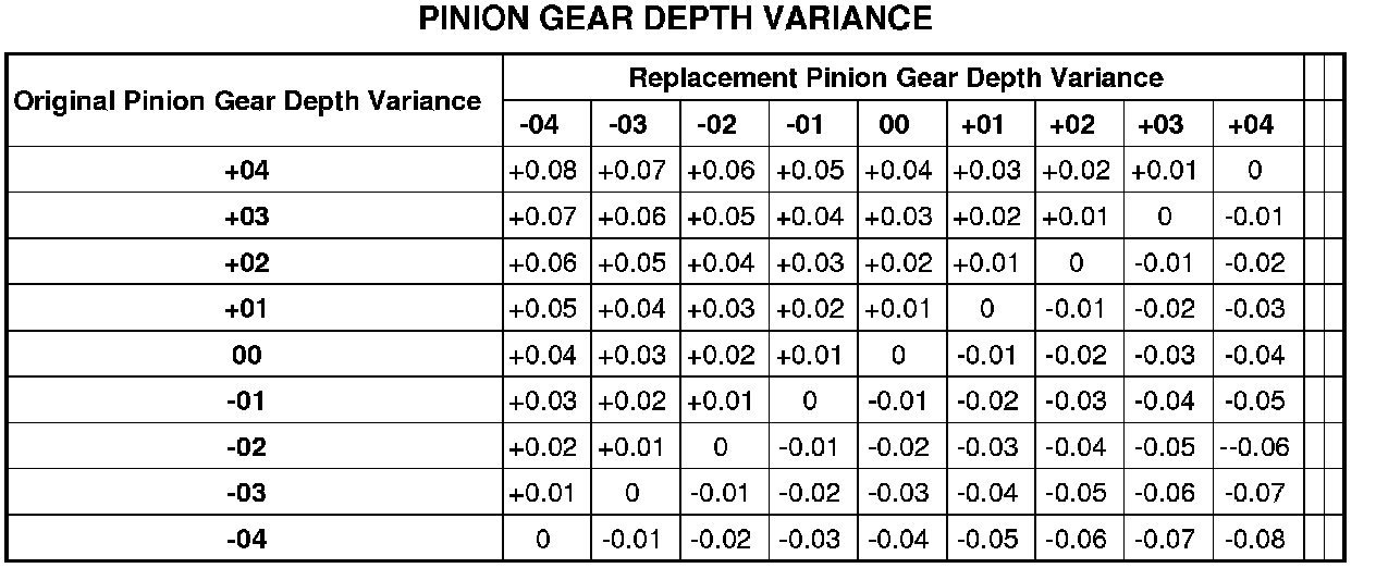 If installing a new gear, note the depth variance number of the original and replacement pinion. Add or subtract this number from the original depth shim to compensate for the difference in the depth variances. The numbers represent deviation from the standard in hundredths of a millimeter. If the number is negative, subtract that value to the required thickness of the depth shims. If the number is positive, add that value from the thickness of the depth shim.