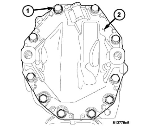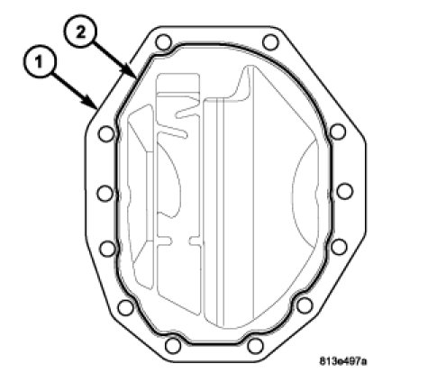 1. After thoroughly cleaning axle housing cover (1), apply a 4 mm (0.157 in.) bead (2) of Mopar(R) Axle RTV as shown.
