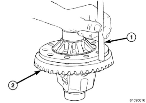 2. Using brass drift (1), remove ring gear (2).