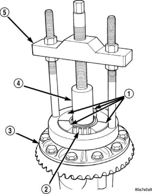 3. Remove bearings (2) from the differential case (3) with Puller/Press C-293-PA (5), Adapters C-293-37 (1) and Puller Extension SP-3289 (4).